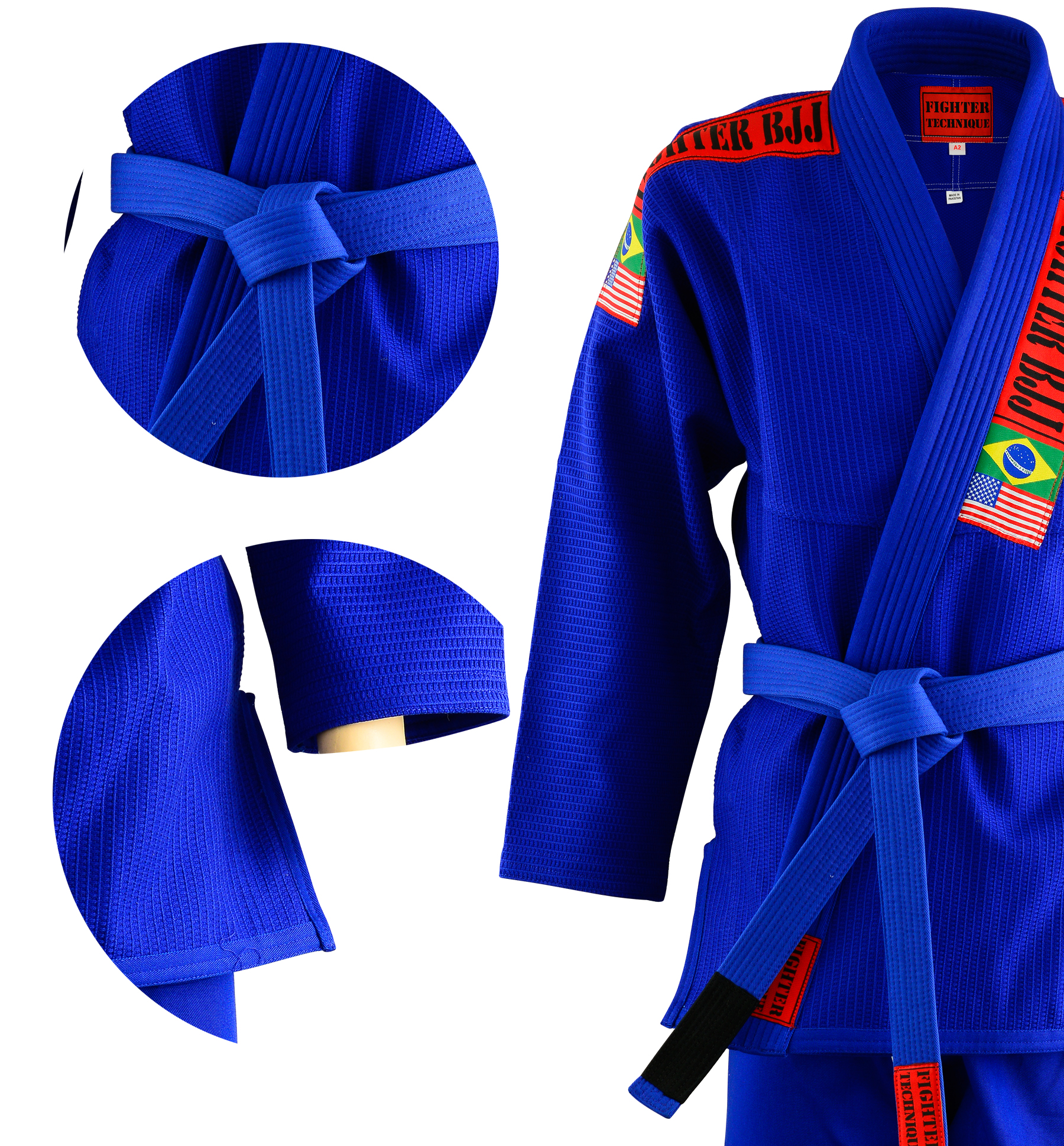 Gold Weave Jiujitsugi. 450grms 12 oz Twillpant. Blue stitching. Blue Trim pre- shrunk Fabric Brief Description;A Brazilian style of jiujitsugi. All stress point reinforced and tripple needle stitched. Pant with normal draw cord. Patches, printings and embroideries are available. colors;whiteBlackBlueNave Blue